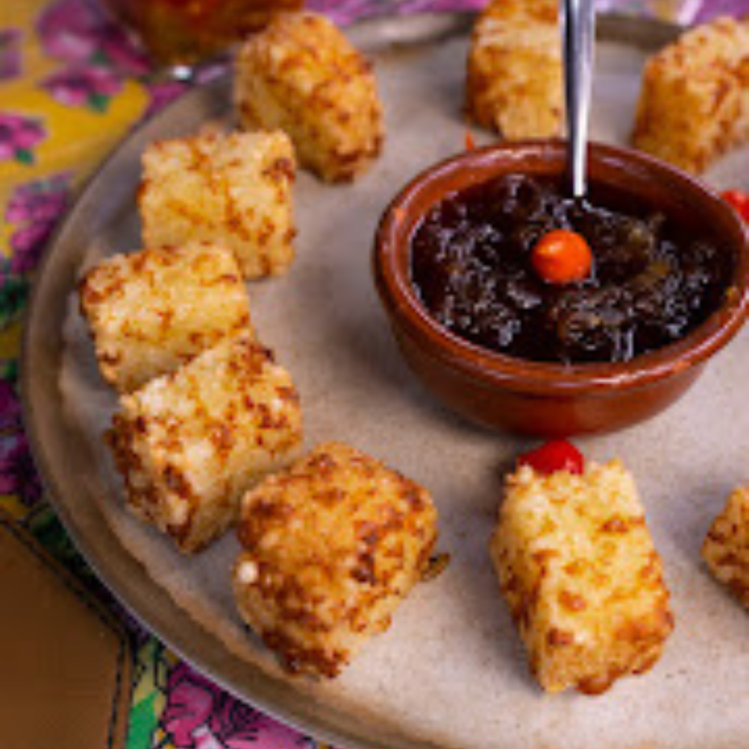 Começamos com as entradas irresistíveis: Dadinho de Tapioca, Bolinho de Carne de Sol e Mandioca Frita e mais. Cada um traz a crocância e o sabor que representam bem a alma da mesa nordestina.